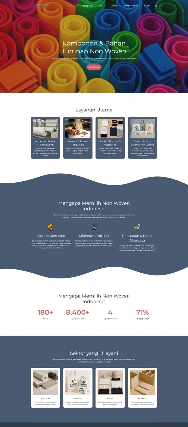 PT NON WOVEN INDONESIA is a modern textile manufacturer founded in 2022 in Tangerang, Indonesia, specializing in non-woven fabric solutions such as spunbond, meltblown, SMS, and hydrophilic/hydrophobic materials for hygiene, medical, agricultural, and industrial applications.